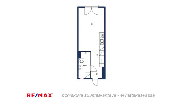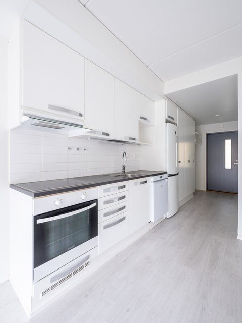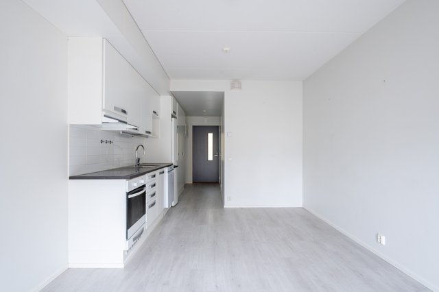 Yksiö, joka tuntuu neliöitään suuremmalta jo kynnyksellä. Luonnonvalo osuu avokeittiön pintoihin, eteisestä aukeaa selkeä ja helppo tila, ja ikkunallinen kylpyhuone tuo arkeen mukavan ylellisyyden sekä lattialämmitys pitää varpaat lämpiminä ympäri vuoden.