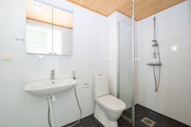 - WC-istuin, suihku, lattialämmitys, bidee-suihku, peili, peilikaappi, pesuallas, ja pesukoneliitäntä