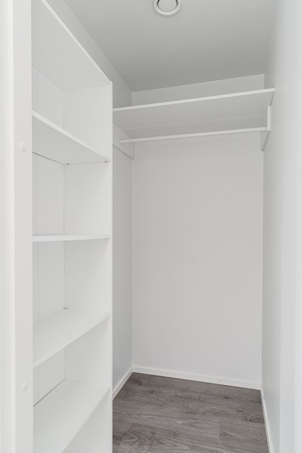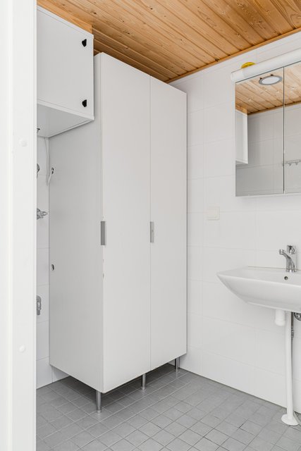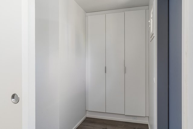 Makuuhuoneessa hyvin kaappitilaa koko seinän osuudella. Kylpyhuone on nykyaikaisesti varusteltu ja tilava, joten arjen askareet sujuvat vaivattomasti.