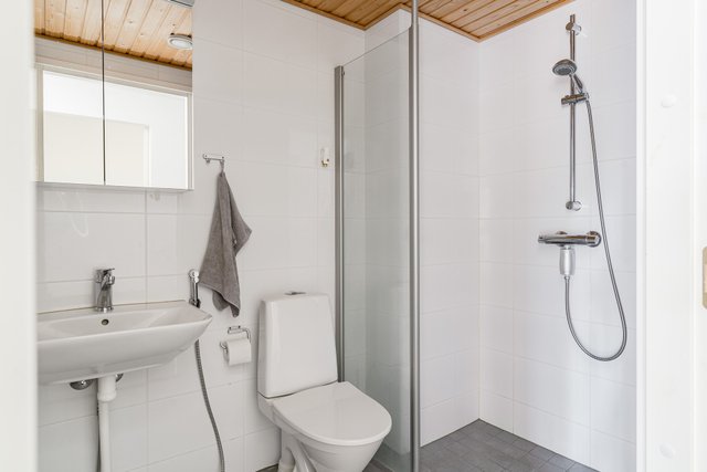 - WC-istuin, suihku, suihkuseinä, pesukoneliitäntä, pesuallas, bidee-suihku, ja allaskaappi