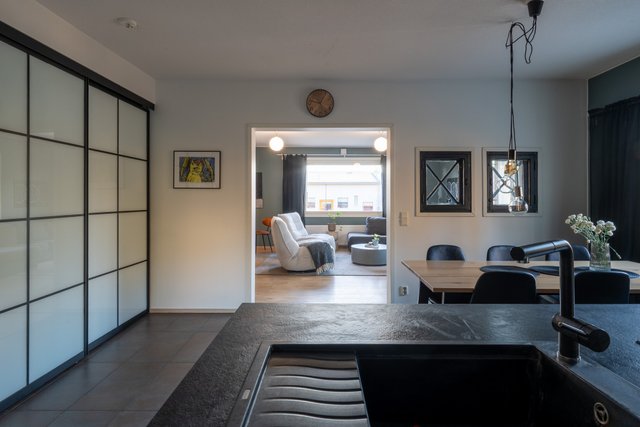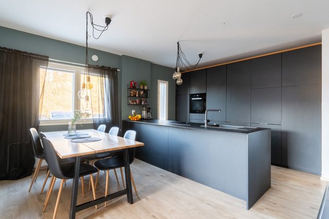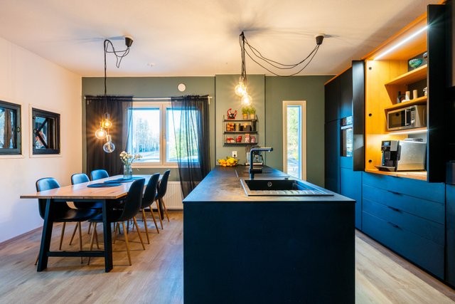 - Kussakin huoneistossa avarat keittiöt ja moderni koneistus. Alakerran huoneistossa as1 on keittiösaareke, jossa induktioliesi ja liesituuletin pöytätasossa aktiivihiilisuodattimella.