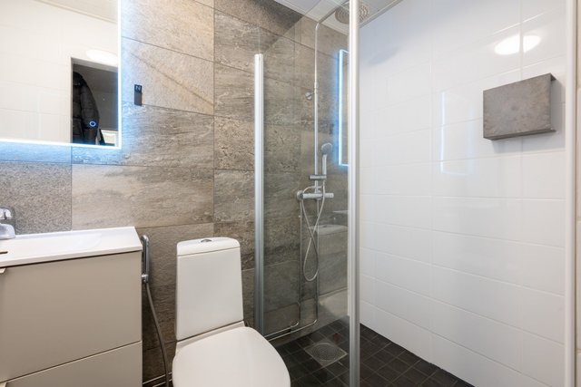 - WC-istuin, suihku, suihkuseinä, lattialämmitys (Sähkökaapeli), peili, allaskaappi, ja bidee-suihku