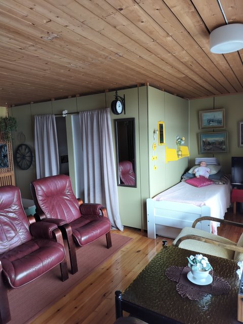 Lämmitys hoituu sähköllä ja puulla, mikä tuo mukavaa tunnelmaa erityisesti talvi-iltoina.