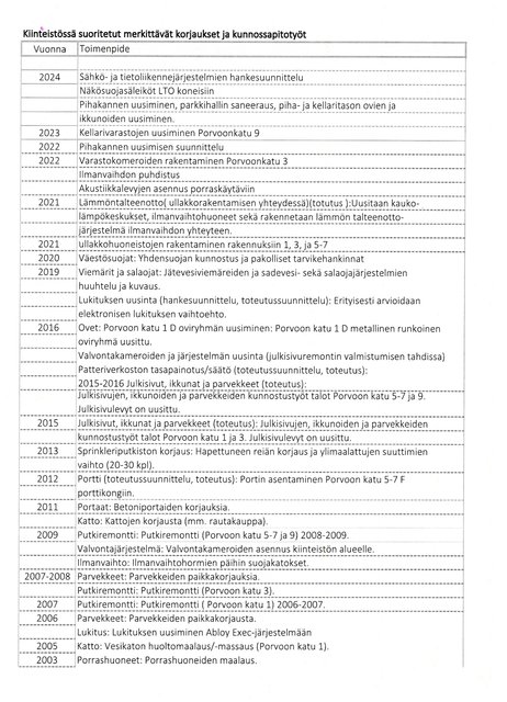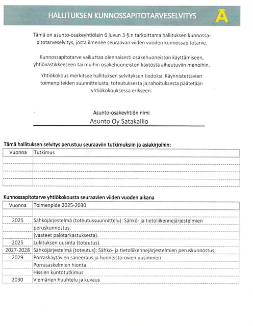- Hallituksen kunnossapitotarveselvitys 2025-2030: 2025 Sähköjärjestelmä (toteutussuunnittelu): Sähkö- ja tietoliikennejärjestelmien peruskunnostus. (vaateet palotarkastuksesta). 2025 Lukituksen uusinta (toteutus). 2027-2028 Sähköjärjestelmä (toteutus): Sähkö- ja tietoliikennejärjestelmien peruskunnostus. 2029 Porraskäytävien saneeraus ja huoneisto-ovien uusiminen, porrasaskelmien hionta, hissien kuntotutkimus. 2030 Viemärien huuhtelu ja kuvaus.