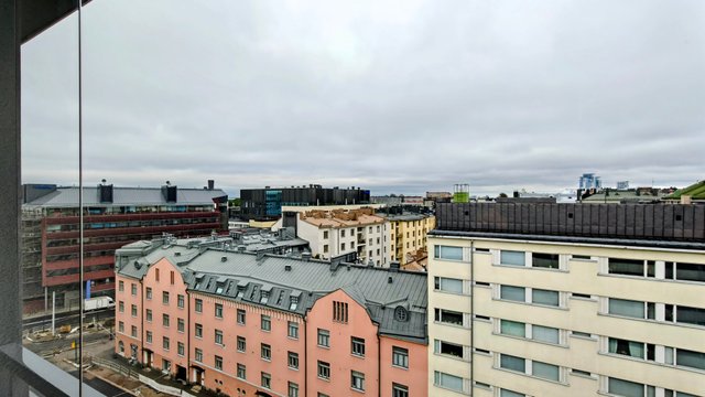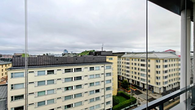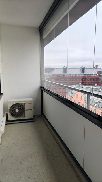 Kalliossa kahdeksannen kerroksen yksiö huoneiston levyisellä lasitetulla parvekkeella.