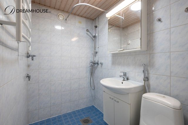 - WC-istuin, suihku, pesukoneliitäntä, lattialämmitys, peilikaappi, pesuallas, allaskaappi, rättipatteri, ja bidee-suihku