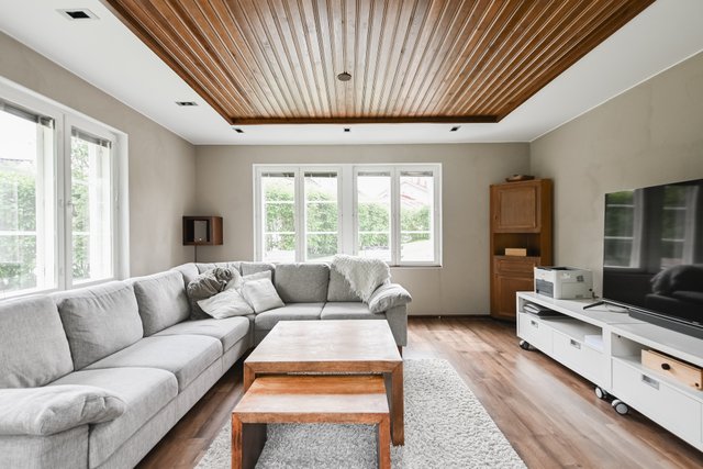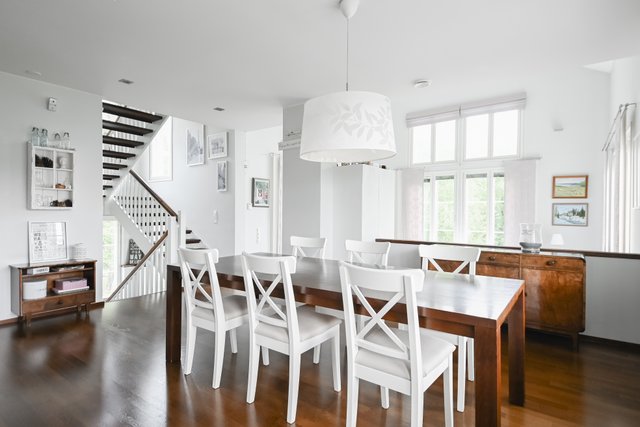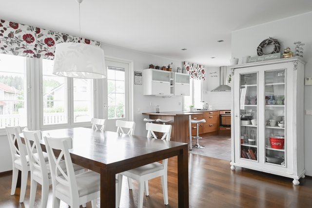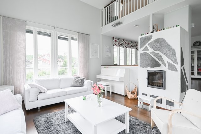 Talon sydän on tilava olohuone hulppealla huonekorkeudella. Olohuoneessa on näyttävä varaava takka. Keittiö on hyvin varusteltu, ja sieltä löytyy kaikki tarvittava arjen sujuvuuteen. Erillinen iso ruokailutila sijaitsee mukavasti olohuoneen ja keittiön välissä, joten vieraiden kanssa seurustelu sujuu vaivattomasti.