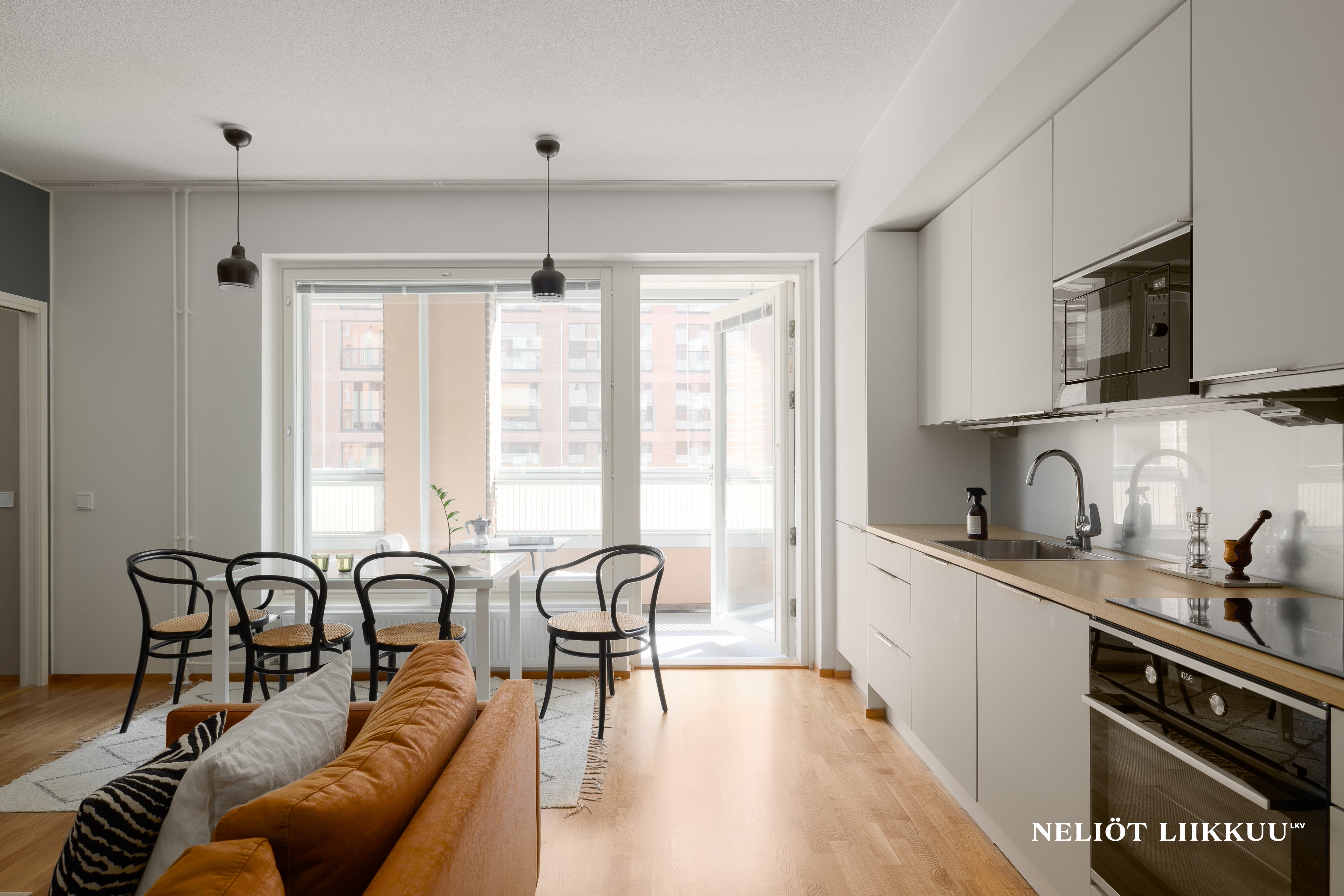 Avara olohuone yhdistyy tyylikkääseen avokeittiöön, josta löytyy lasku- ja kaappitilaa. Olohuone jatkuu tilavalle lasitetulle parvekkeelle, joka toimii puolet vuodesta kolmantena huoneena. Makuuhuoneeseen mahtuu parisänky sekä tarvittaessa myös etätyöpiste. Tilavan makuuhuoneen yhteydessä on käytännöllinen vaatehuone. Kodista löytyy kookas kylpyhuone. Koneellinen ilmanvaihto varmistaa raikkaan sisäilman.