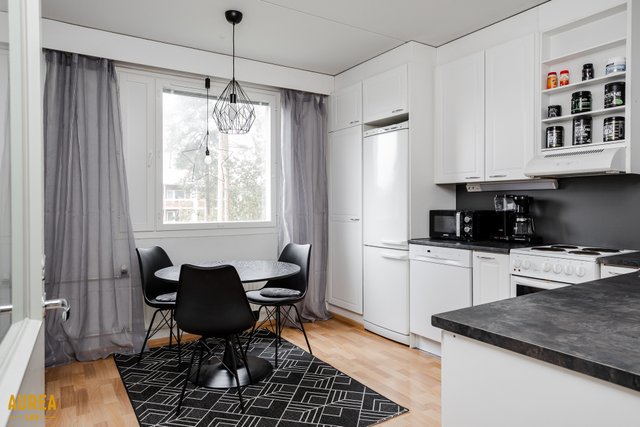 - Tyylikäs ja siisti keittiö. Runsaasti kaappitilaa.