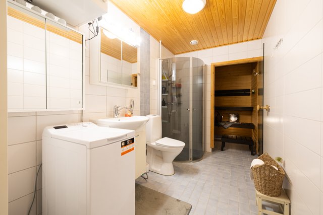 - Pesukoneliitäntä, suihkuseinä, wc-istuin (uusittu n. 4-5 v. sitten), lattialämmitys, peilikaappi, suihku, kiinteät valaisimet, bidee-suihku, pesuallas, ja allaskaappi