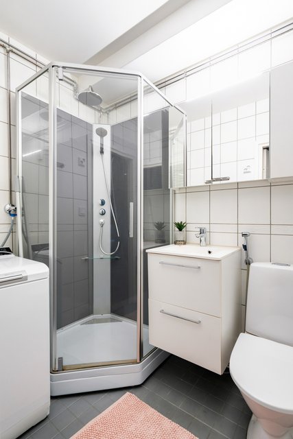 - Suihku, wc-istuin, suihkukaappi, allaskaappi, bidee-suihku, pesuallas, ja pesukoneliitäntä
