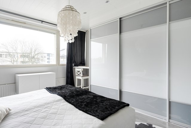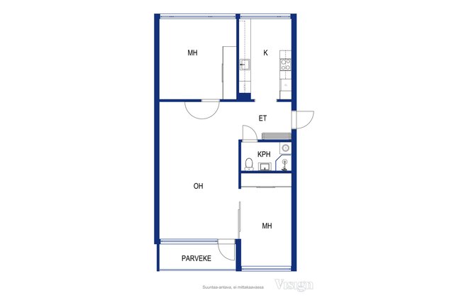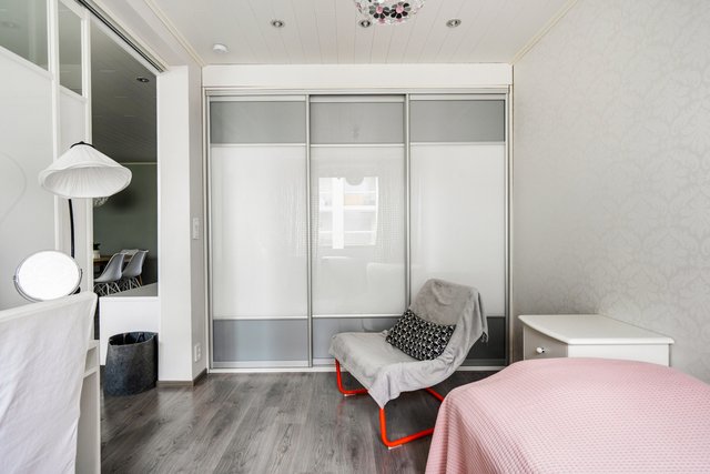 Läpitalon huoneisto, jonka makuuhuoneet sijaitsevat erillään toisistaan. Erillinen keittiö, johon mahtuu ruokapöytä. Lasitettu parveke ilta-auringon puolella, johon on asennettu Visorin parvekekaihtimet.