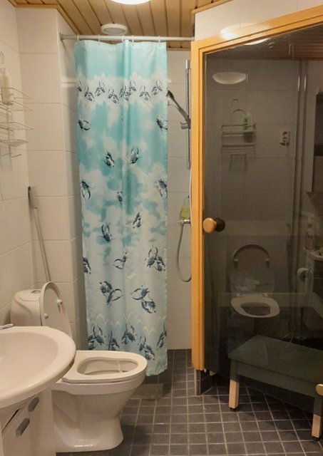 - WC-istuin, suihku, pesukoneliitäntä, lattialämmitys, peilikaappi, pesuallas, allaskaappi, ja bidee-suihku