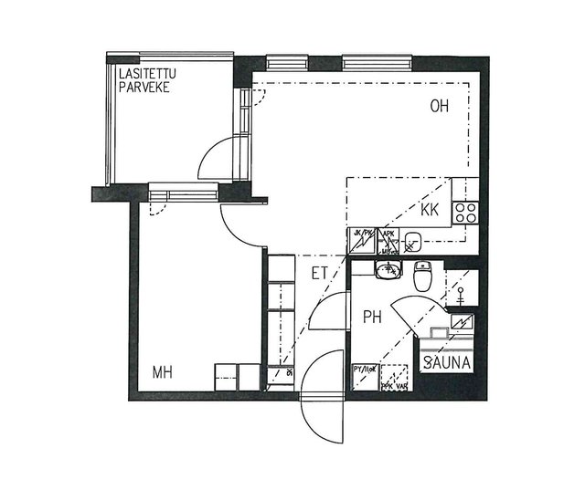 Tupakeittiö + mh + ph + s + lasitettu parveke.