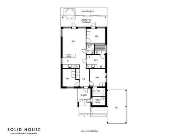- Avokeittiö. Jääkaappipakastin, erillisuuni, mikroaaltouuni, liesituuletin, astianpesukone, induktioliesi, saareke. Kaikki kodinkoneet integroitu. Lattia laminaattia, seinät maalattu.