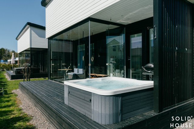 Ulkotilassa osittain lasitettu terassi ulkoporealtaalla. Asunnon etupihalla on katospaikka ja pihapaikka autolle, ja sähköauton latausmahdollisuus on järjestetty.