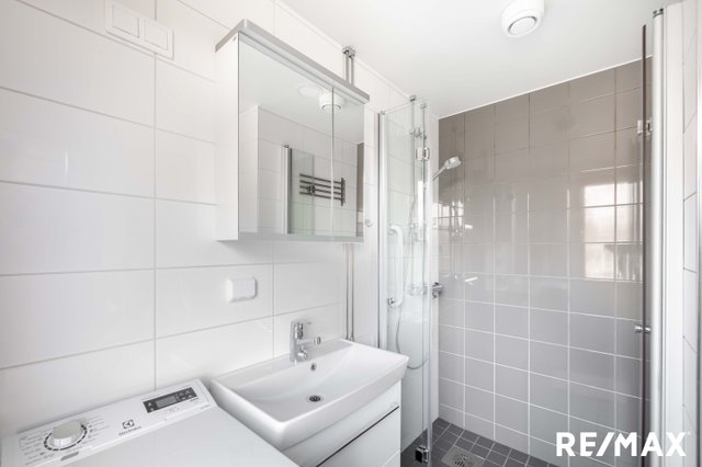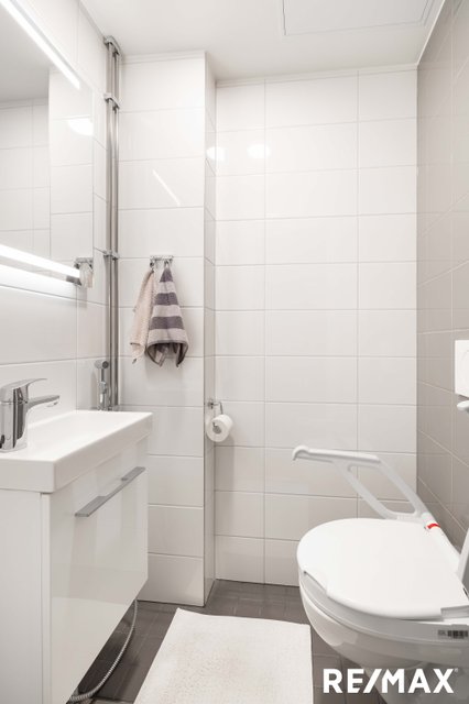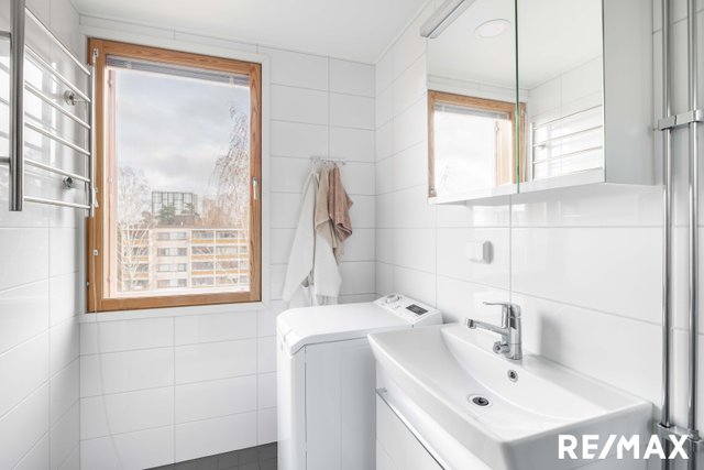 - WC-istuin, suihku, suihkuseinä, pesukoneliitäntä, peilikaappi, pesuallas, allaskaappi, ja lattialämmitys