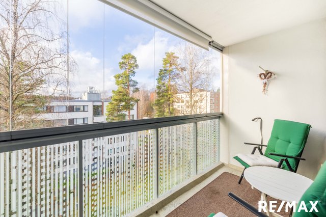 Olohuoneeseen siivilöityy valoa isosta ikkunasta ja tilan jatkeena oleva lasitettu parveke tarjoaa upeat maisemat.