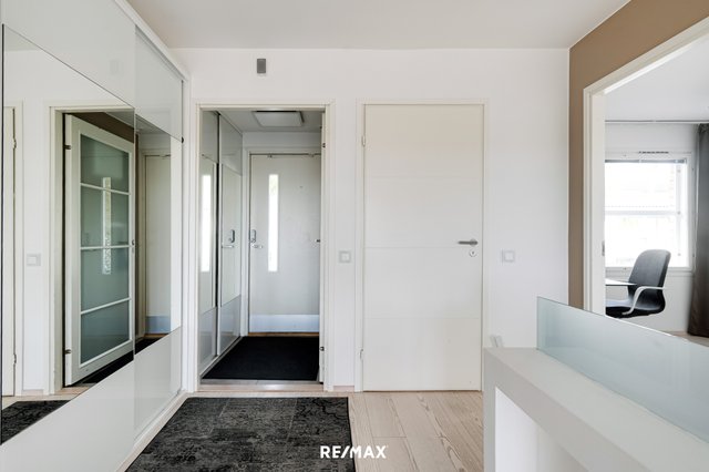 - Tuulikaapissa on kosteudenkestävä laattalattia, sekä peililiukuovelliset kaapistot. Peilikaapistot jatkuvat peremmälle eteisen puolelle.