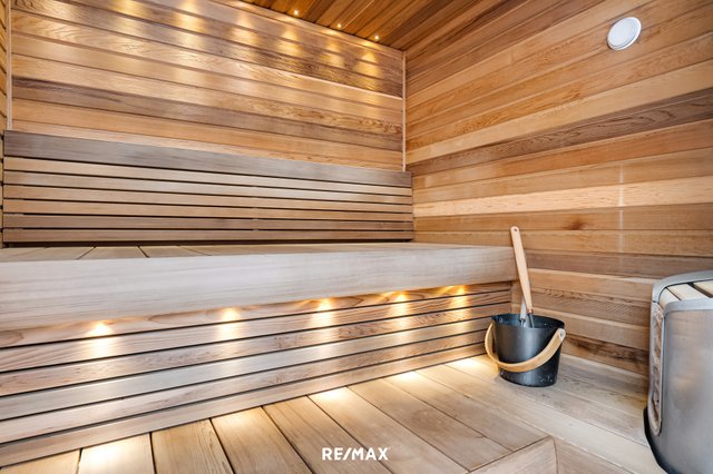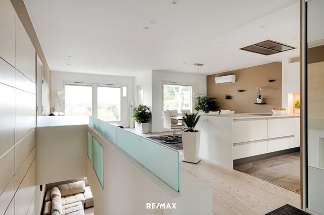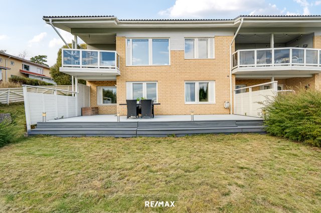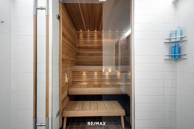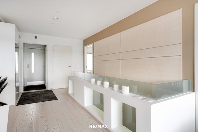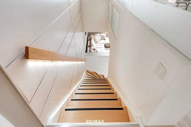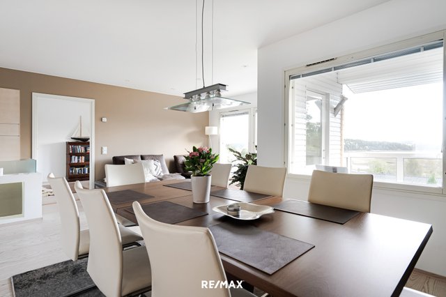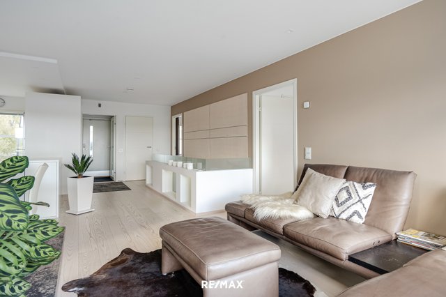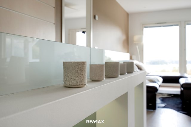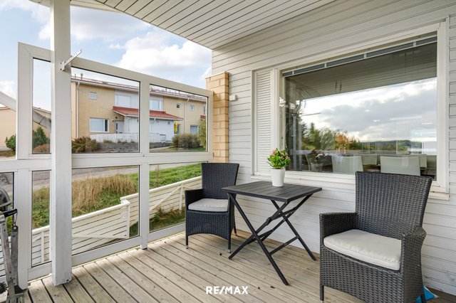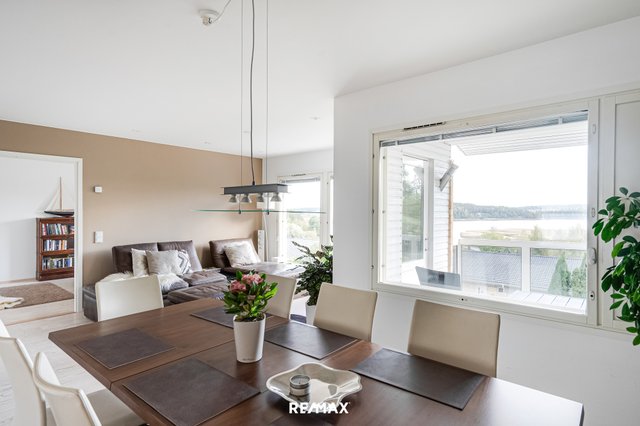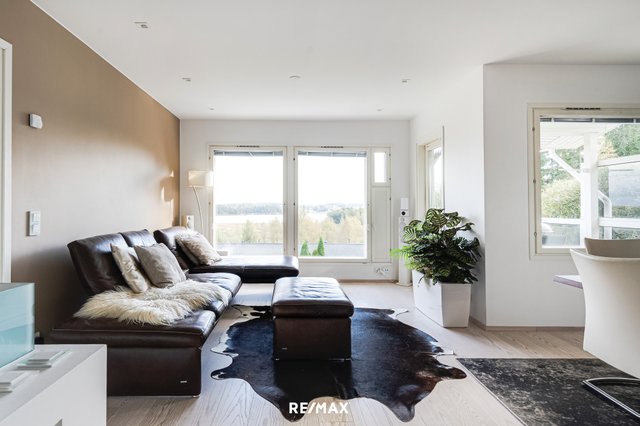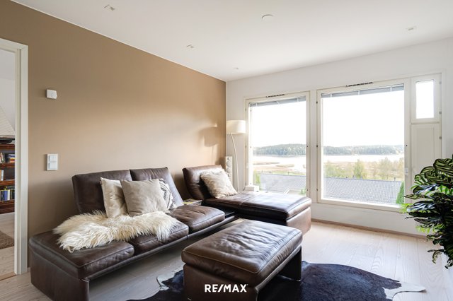 - Yläkerran olohuoneessa on suuret ikkunat ja upea korkea esteetön merinäkymä sekä käynti parvekkeelle. Himmennettävät LED:t upotettu kattoon. Upea puinen korosteseinä portainen yllä, sekä uniikki valaistu betonikaide lasielementeillä. Alakerran tilavassa olohuoneessa on upea kiviaiheinen korostetapetti, ja kulku omalle takapihan terassille ja nurmelle.