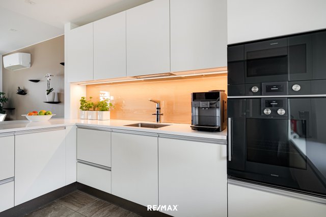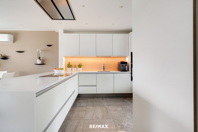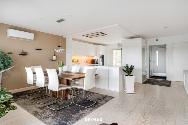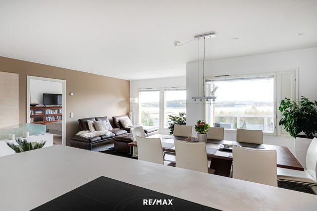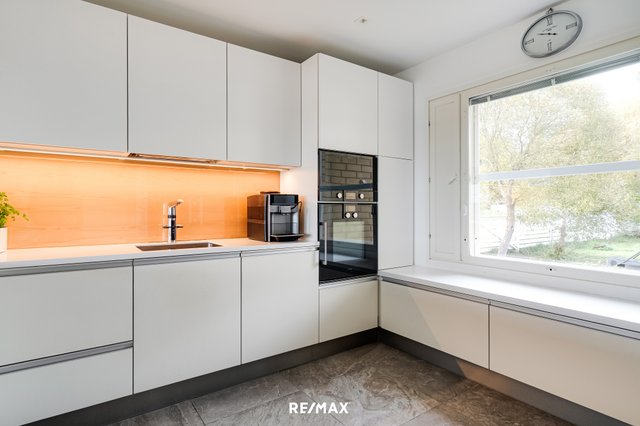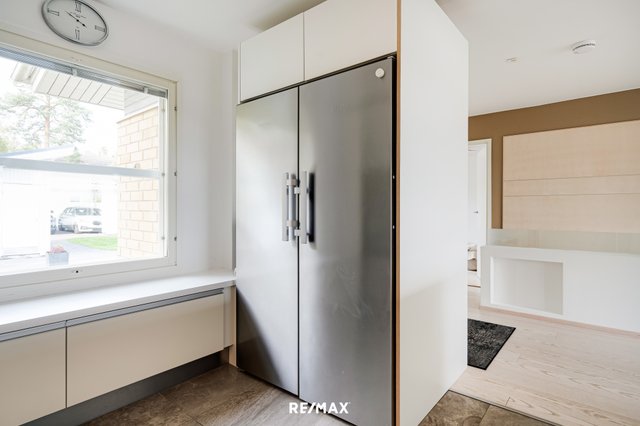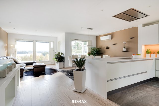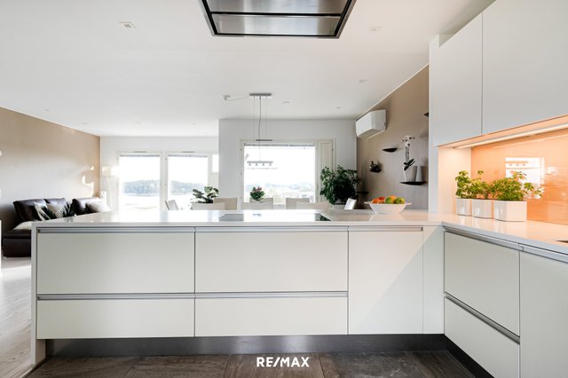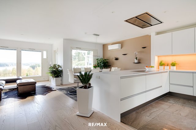 - Upea, äärimmäisen tilava ja laadukas v. 2018 valmistunut Puustellin avokeittiö saumattomilla Corian-komposiittitasoilla ja esteettömällä merinäkymällä. Keittiön edustalla on ruokailutila suurelle ruokailuryhmälle sekä viilennyspumppu. Jätekaappi avautuu töytäisyllä ja altaan yllä LED-valo syttyy käden heilautuksella. Isossa niemekkeessä on valtavasti kaappitilaa molemmin puolin. Katossa upotetut LED:t ja kaapistojen välissä kaunis puuelementti, jossa lasi päällä.
