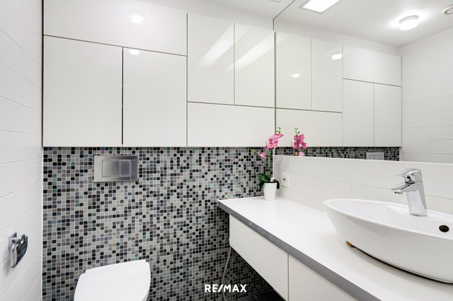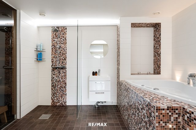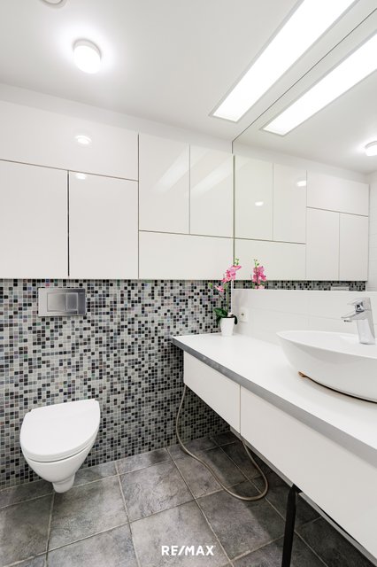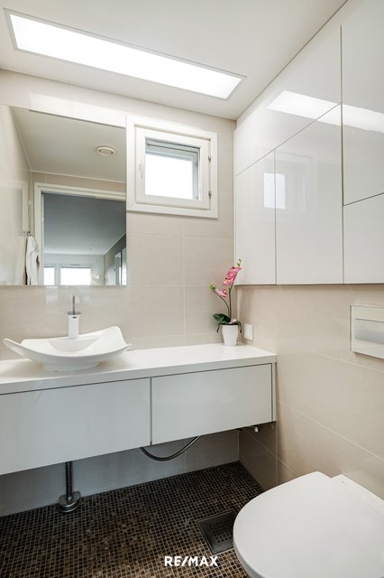 - 1) Yläkerrassa eteisen yhteydessä on upea v. 2008 remontoitu wc-tila. Sen varustuksena on seinä-wc, peili, allas kaapistolla, bidee-suihku ja seinäkaapistot. Upeat laatoitukset seinässä sekä lämmitetyssä lattiassa. 2) Alakerran erillinen kaunis wc on remontoitu v. 2008. Sen varustuksena on allas tasolla ja kaapistolla, seinä-wc, seinään laatoitettu iso peili, LED-valaistus ja bidee-suihku. Kaunista laatoitusta seinässä sekä lämmitetyssä lattiassa.