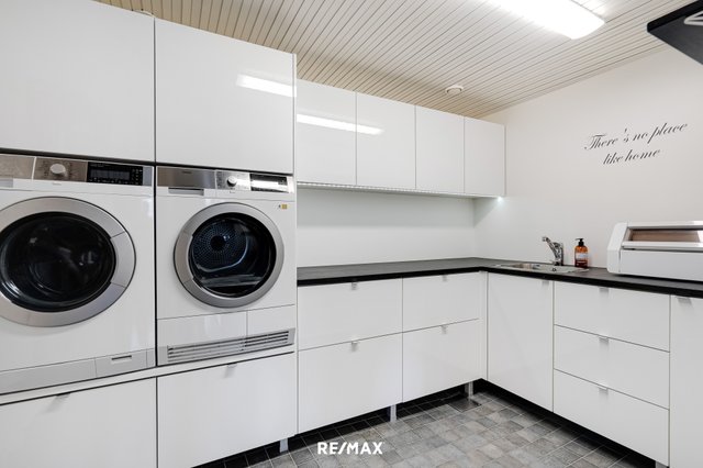 Alakerta pitää sisällään myös erillisen kodinhoitohuoneen täysine varustuksineen. Sen yhteydessä on myös varastotila portaiden alla, joten jokainen neliö on otetty hyötykäyttöön. Alakerrasta löytyy toinen erillinen wc, joka luo tilaa ja yksityisyyttä koko perheelle. Wc- ja saunatilat on laatoitettu kaikki kerrassaan upeilla ja näyttävillä laatoituksilla.