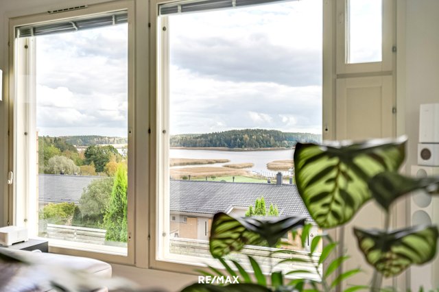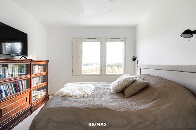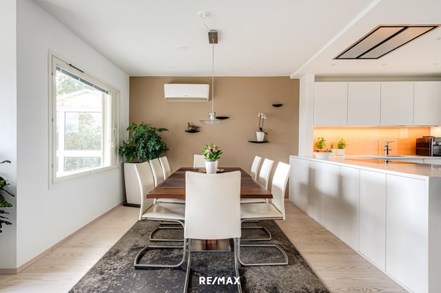 Upeasti v. 2018 arkkitehtitoimisto Sabelsströmin suunnittelema ja pintaremontoitu yläkerta on avattu upeaksi avoimeksi tilaksi, josta löydät kodin oleskelu- ja ruokailutilat. Valtava Puustellin ajaton keittiö on varusteltu laadukkaasti ja ajatuksella viimeistä piirtoa myöten. Kattomallinen liesituuletin imee käryt eikä mikään kokkaillessa estä merinäkymää, työvalon saat päälle käden heilautuksella. Upeat saumattomat Corian komposiittitasot upotetuilla liedellä ja altailla ja integroidut Gaggenaun laatukoneet kruunaavat ruoanlaiton kokemuksen.