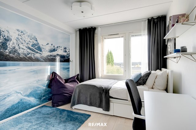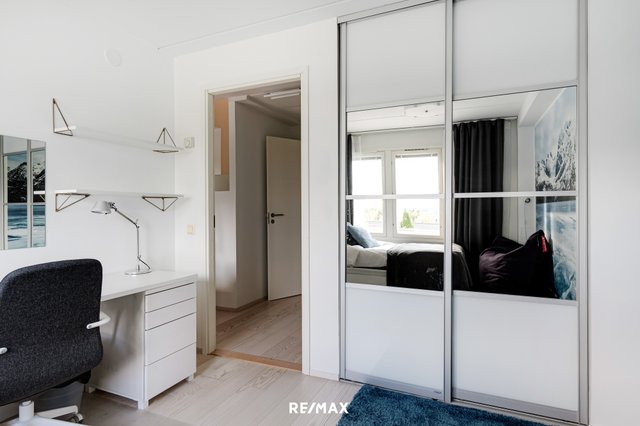 - Ylhäällä kaksi makuuhuonetta joiden yhteydessä on erilliset vaatehuoneet. Alakerrassa kaksi makuuhuonetta, joiden yhteydessä kiinteät vaatekaapistot. Toisessa alakerran huoneessa kaunis talviaiheinen korostetapetti.