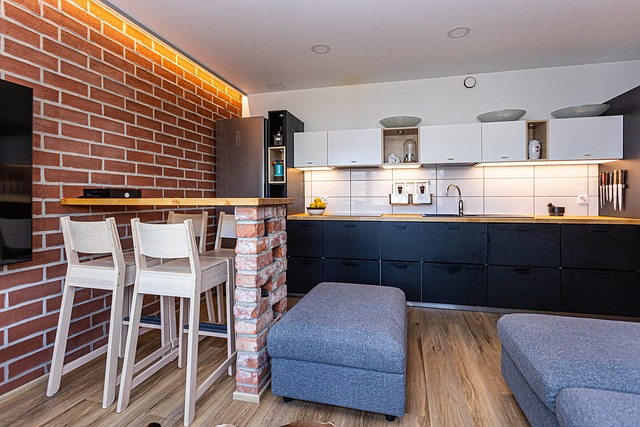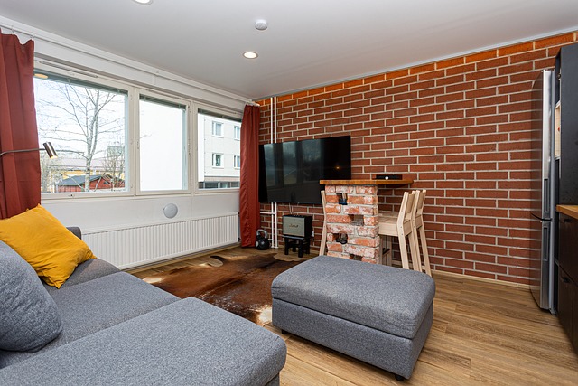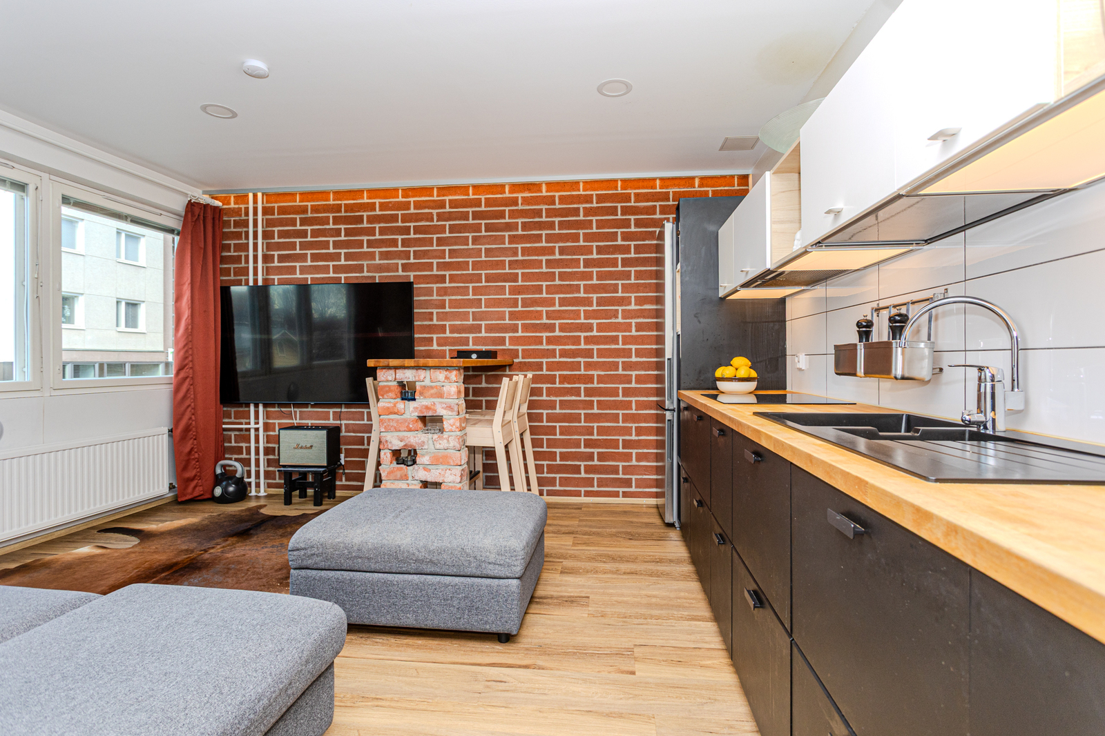 - Osa seinistä tiilipinnalla ja katto maalattu. Keittiön työtasot massiivikoivua.