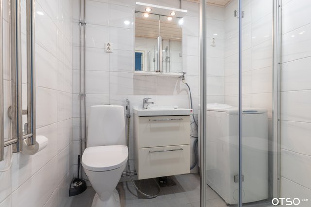 - WC-istuin, suihku, suihkuseinä, pesukone, pesukoneliitäntä, pesuallas, allaskaappi, ja peilikaappi