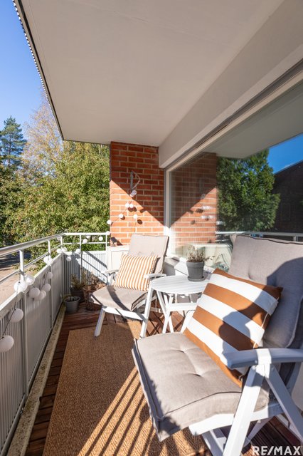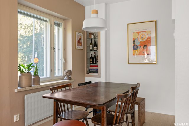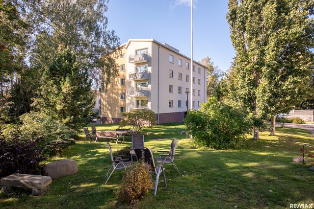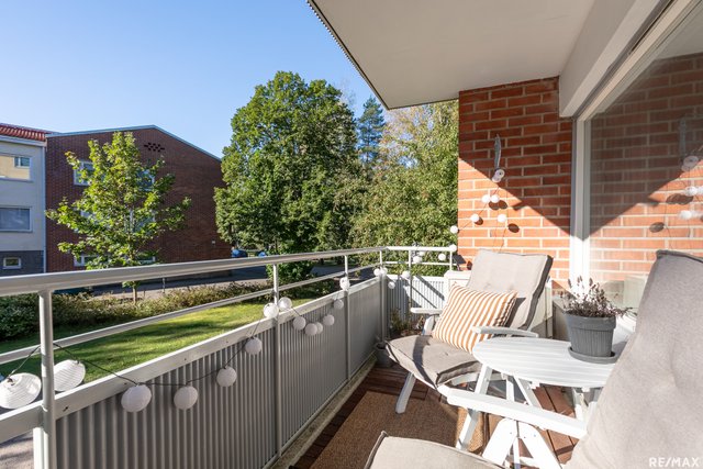 Heti eteiseen astuessasi huomaat tämän pohjaratkaisun avaruuden sekä tilojen toimivuuden. Valoa tulvii ikkunoista sisään tähän kulmahuoneistoon kahdesta ilmansuunnasta ja pintapuolisesti asunto on hyväkuntoinen, eli muuttovalmis. Tilavan makuuhuoneen säilytystilojen lisäksi asunnosta löytyy erillinen vaatehuone, jota on käytetty myös työhuoneena. Kylpyhuone on remontoitu putkiremontin yhteydessä ja sieltä löytyy myös pyykinpesukoneelle paikka. Hyväkuntoisesta keittiöstä löytyy paljon kaappi- sekä laskutilaa ja se yhdistyy kätevästi ruokailutilaan sekä olohuoneeseen. Olohuoneesta on käynti etelään suuntautuvalle parvekkeelle. Huoneiston näkymät ovat Puistokaarelle tyypilliset, rauhaisat sekä puistomaiset. Taloyhtiön rinnetontti rajoittuu Myllykallion metsäiseen viheralueeseen. Tämä koti on tällä hetkellä vuokrattu toistaiseksi voimassaolevalla vuokrasopimuksella.