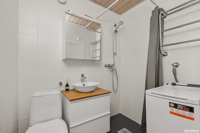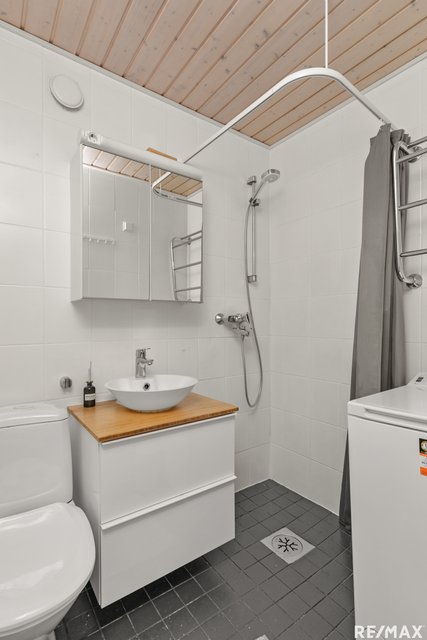 - WC-istuin, suihku, lattialämmitys, pesukoneliitäntä, ja peilikaappi