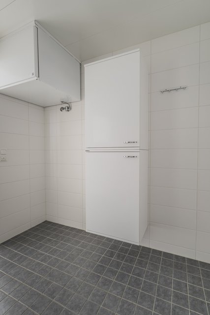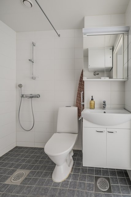 - WC-istuin, suihku, pesukoneliitäntä, lattialämmitys, peilikaappi, pesuallas, allaskaappi, bidee-suihku, ja pyykkikaappi, tila pesutornille