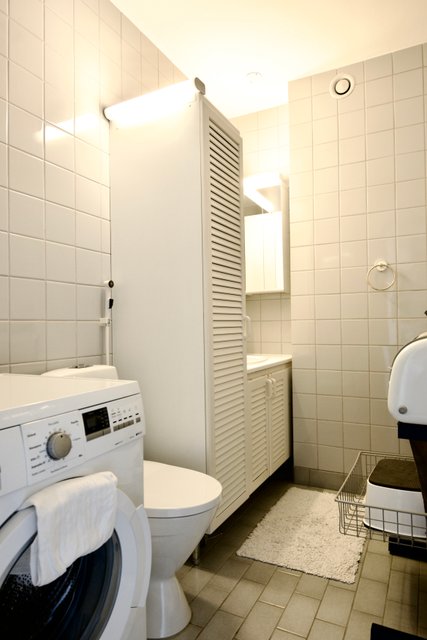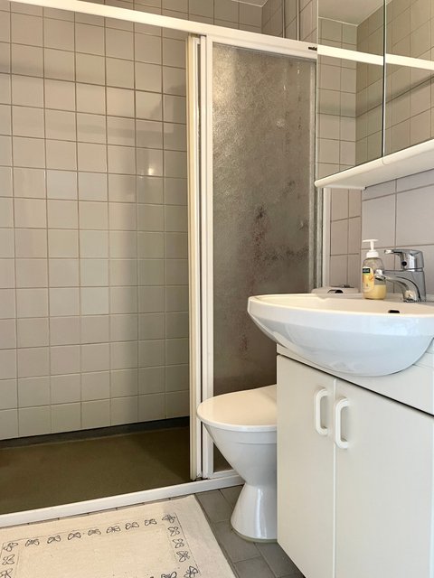 - WC-istuin, suihku, suihkuseinä, peilikaappi, pesuallas, allaskaappi, ja pesukone