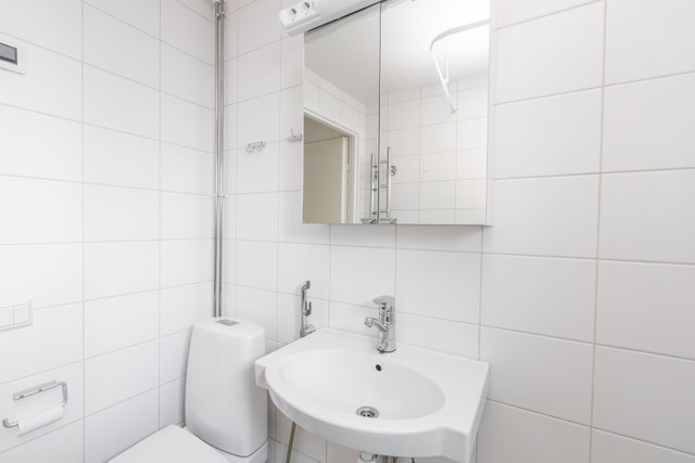 - WC-istuin, suihku, pesukoneliitäntä, lattialämmitys, peilikaappi, ja pesuallas