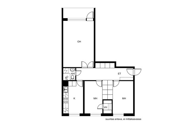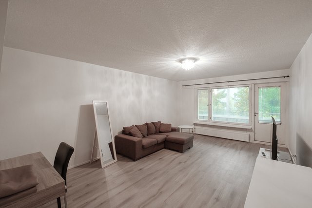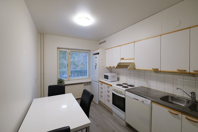 Tilava olohuone tarjoaa runsaasti luonnonvaloa suurista ikkunoista, ja keittiössä on hyvin kaappitilaa sekä paikka ruokapöydälle. Kaksi makuuhuonetta mahdollistavat joustavat asumisratkaisut esimerkiksi lapsiperheelle tai etätyötilaa kaipaaville.