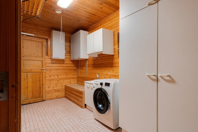 - Pesukoneliitäntä, pesuallas, ja pyykkikaapit
