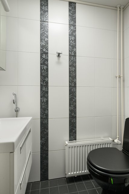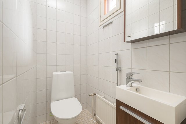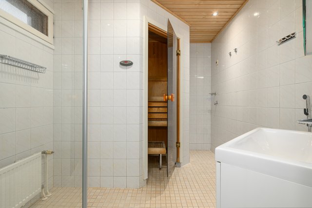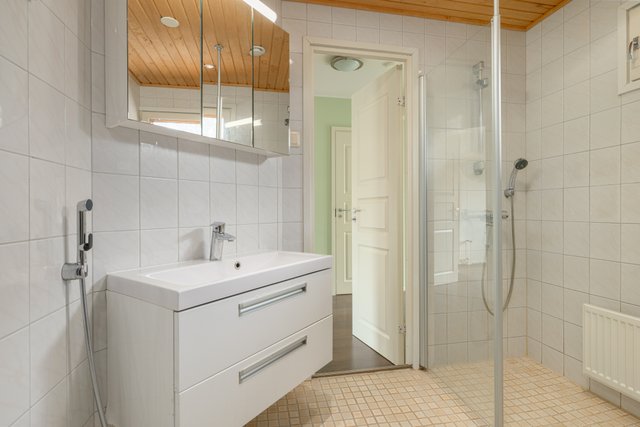 - Suihku, suihkuseinä, pesukoneliitäntä, lattialämmitys, peilikaappi, ja allaskaappi