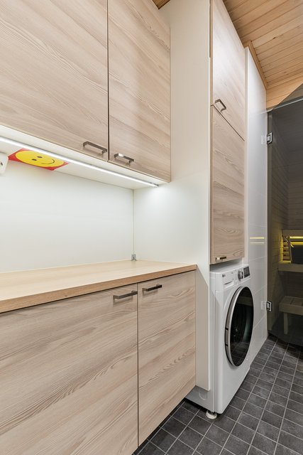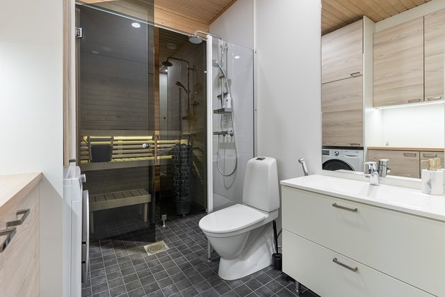 - WC-istuin, suihku, suihkuseinä, pesukoneliitäntä, lattialämmitys, peili, pesuallas, bidee-suihku, ja allaskaappi