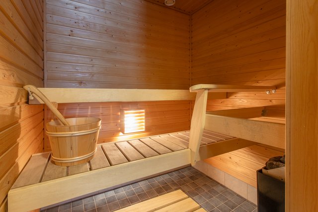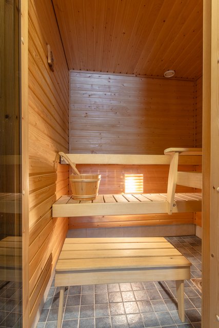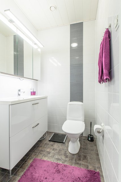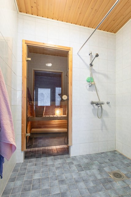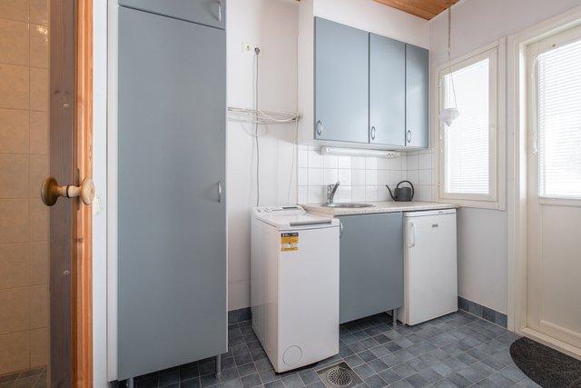 - Lattialämmitys, pesukoneliitäntä, tila pesutornille, pesuallas, pyykkikaapit, lattiakaivo, ja pöytätaso