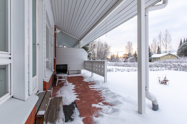 - Katettu terassi lännen puolella, käynti olohuoneesta.