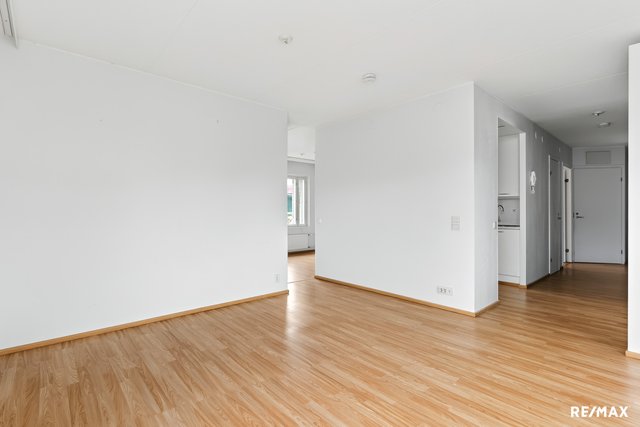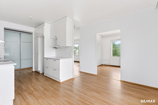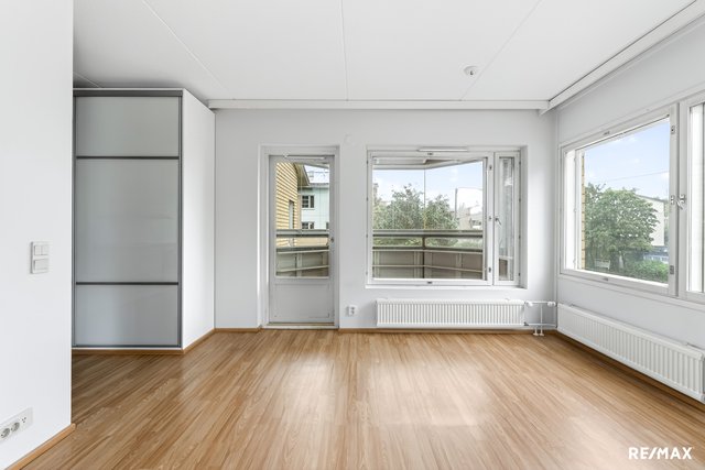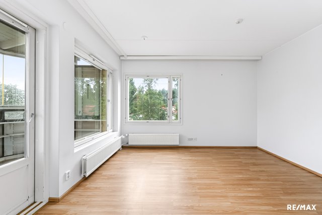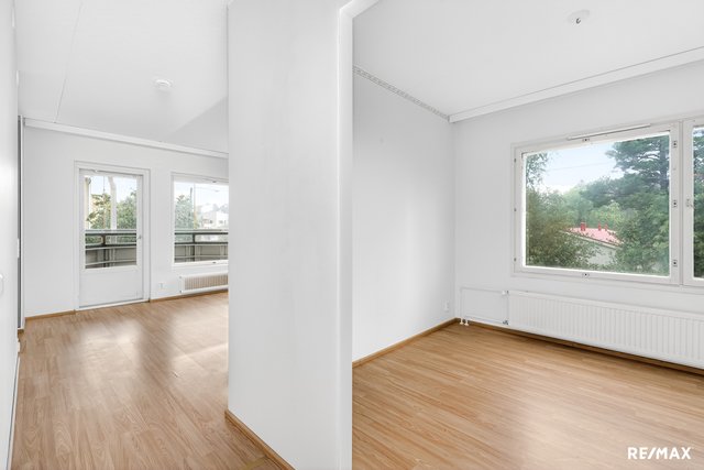 - Laminaattilattia, maalatut seinät, kulku parvekkeelle olohuoneesta.