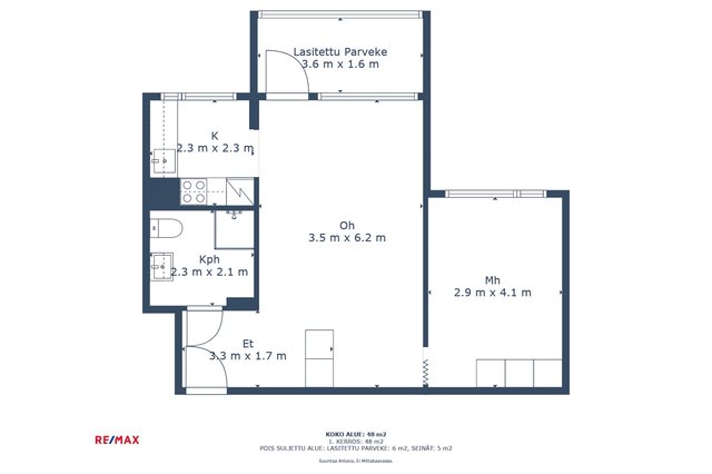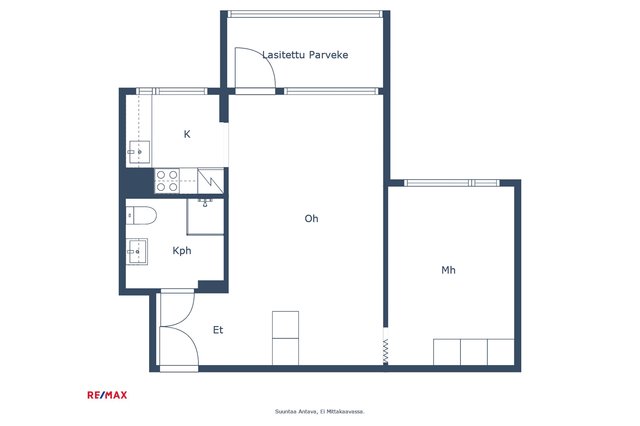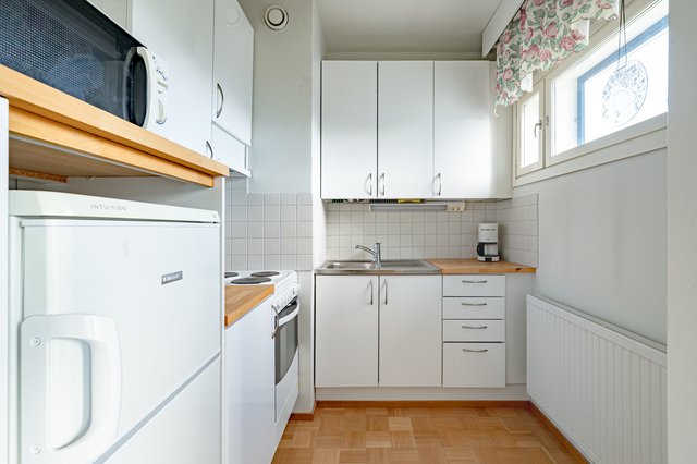 - - Sähköliesi - Jääkaappi (jenkkikaappi) - Mikroaaltouuni - Kaapistot - Liesituuletin Lattia: parketti Seinät: maalattu