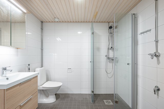 - Remontoitu putkisaneerauksen yhteydessä 2020 Varustus: - WC - Allaskaappi - Peilikaappi - Suihku - Kääntyvät suihkuseinät - Pesukoneliitäntä Lattia: laatta Seinät: laatta