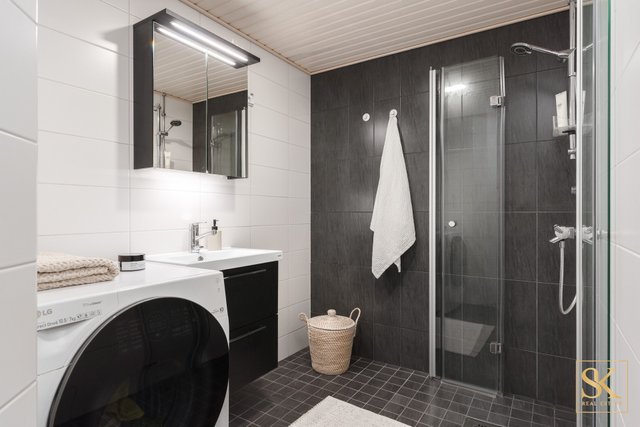 - Suihku, suihkuseinä, pesukoneliitäntä, lattialämmitys (Mukavuuslattialämmitys), peilikaappi, pesuallas, ja allaskaappi