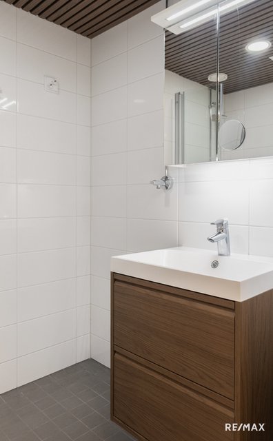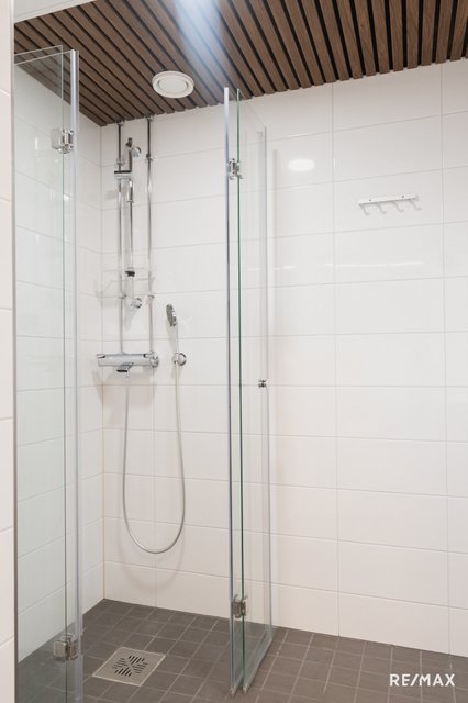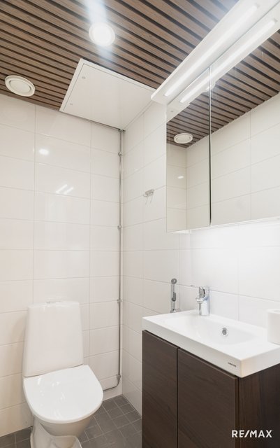 - Peilikaappi, allas, allaslaatikosto, suihku, suihkuseinät, pesukoneliitäntä, vesikiertoinen lattialämmitys, seinät ja lattia laattaa. Kylpyhuoneen kalustus uusittu v. 2025.