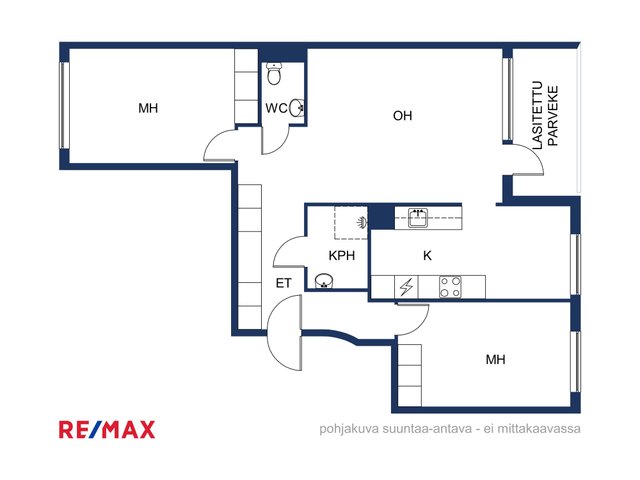 - Peilikaappi, wc-istuin, allas, allaslaatikosto, bideesuihku, seinät ja lattia laattaa. Kalustus uusittu osittain v. 2025.