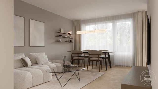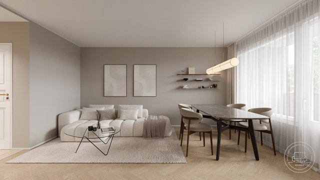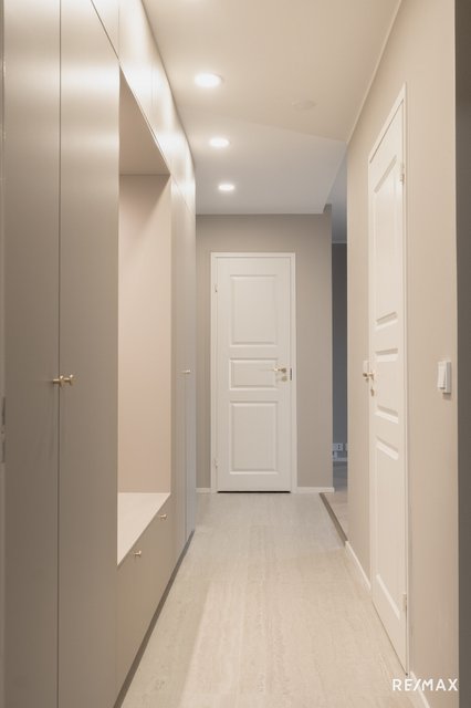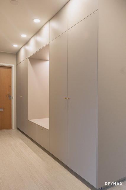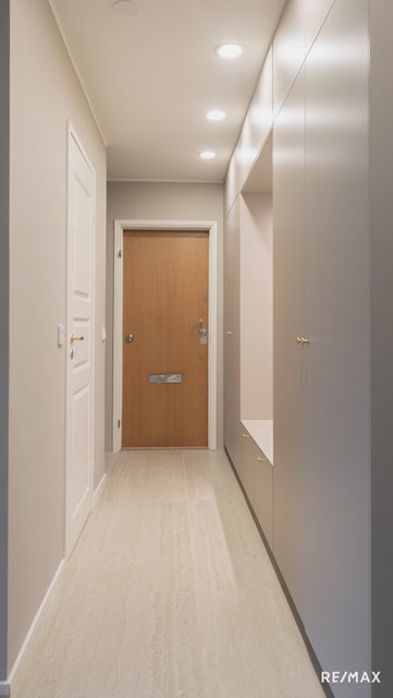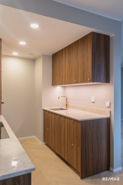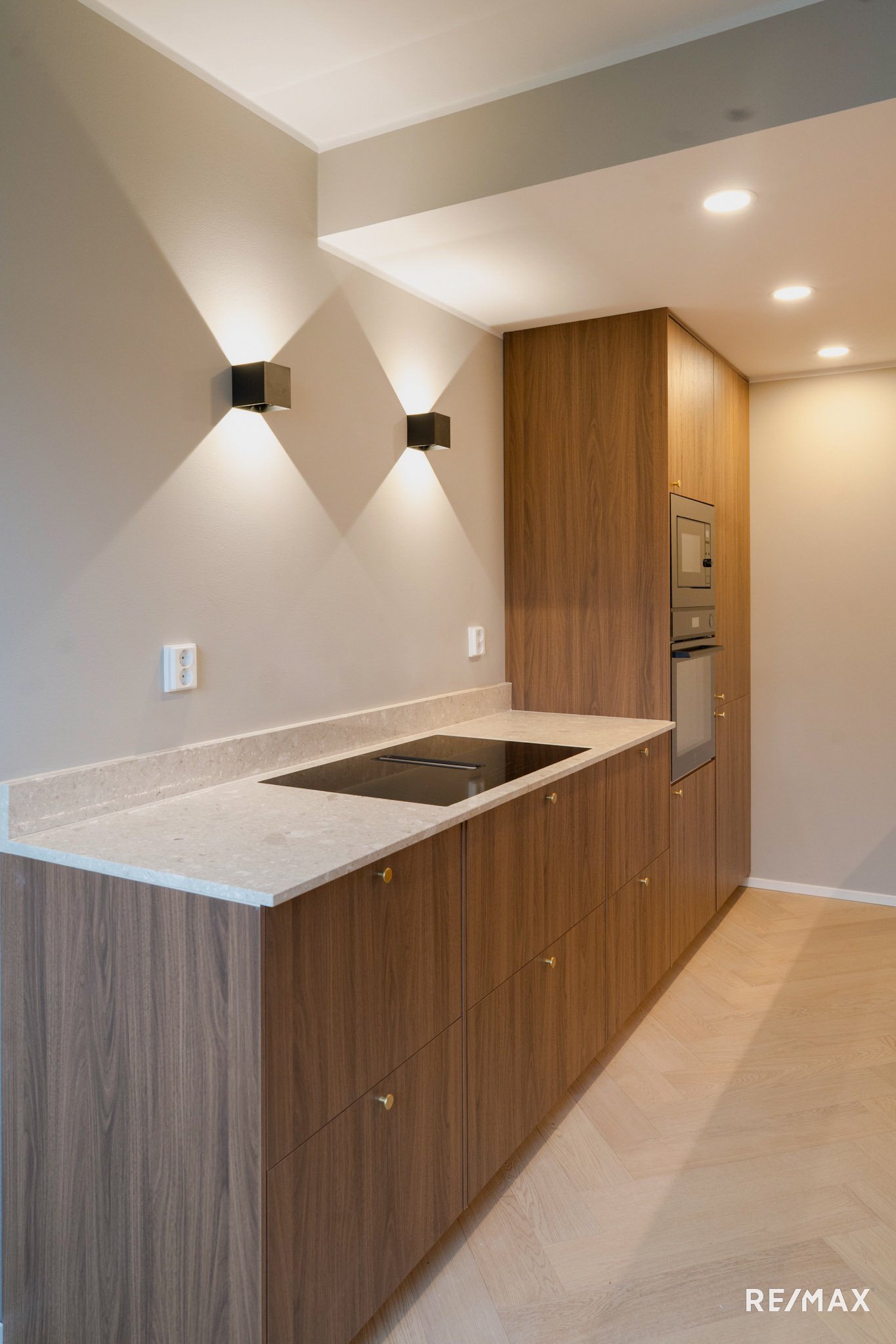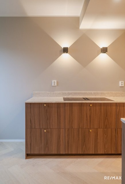 - Pähkinän väriset keittiön kaapistot, työtaso Terrazzo Perlato Royal 20 mm, kalusteuuni, induktio liesitaso, liesitasoon upotettu liesituuletin (aktiivihiili), integroitu astianpesukone, integroitu jääkaappi/ pakastin, mikroaaltouuni, kiinteät valaisimet, seinät maalattu ja lattia Nova Floor – Meister PS 500 Tammi Pure Harmoninen kalanruoto mattalakattu parketti.
