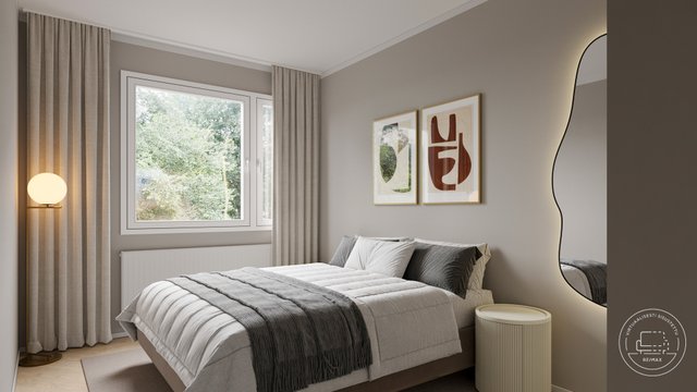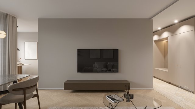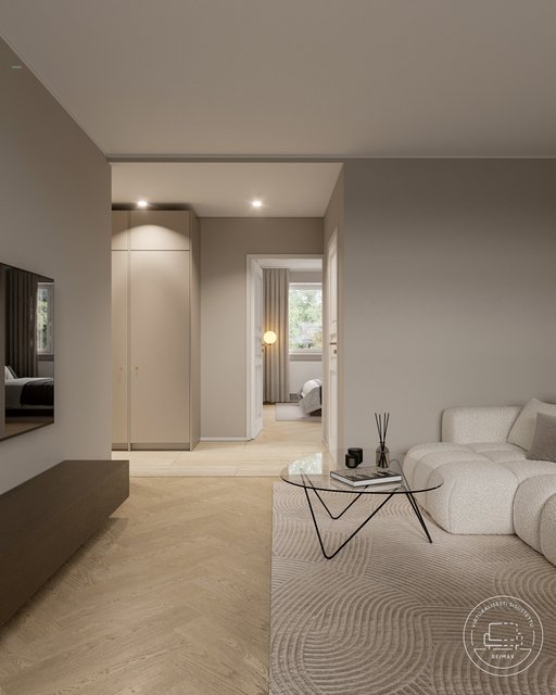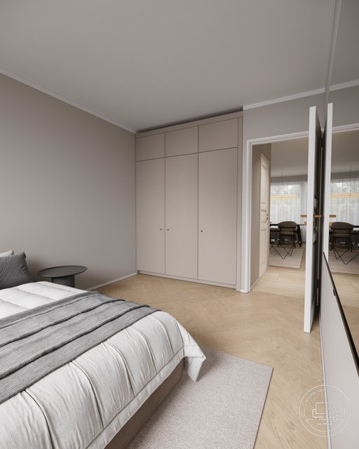 - Seinät maalattu greige, täyshimmeä maali, lattia Nova Floor – Meister PS 500 Tammi Pure Harmoninen kalanruoto mattalakattu parketti.